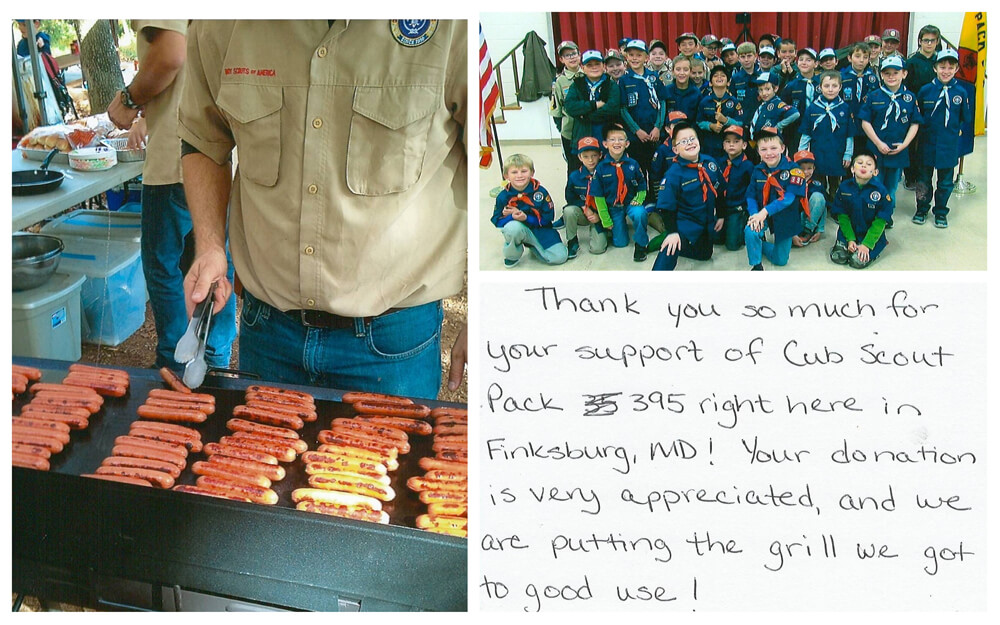We were happy to donate to local Finksburg Cub Scout Pack 395 to help them purchase grills for their annual fall camping trip. The camping trip had an attendance of over 100 members and family.